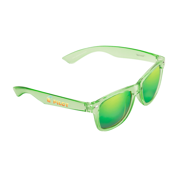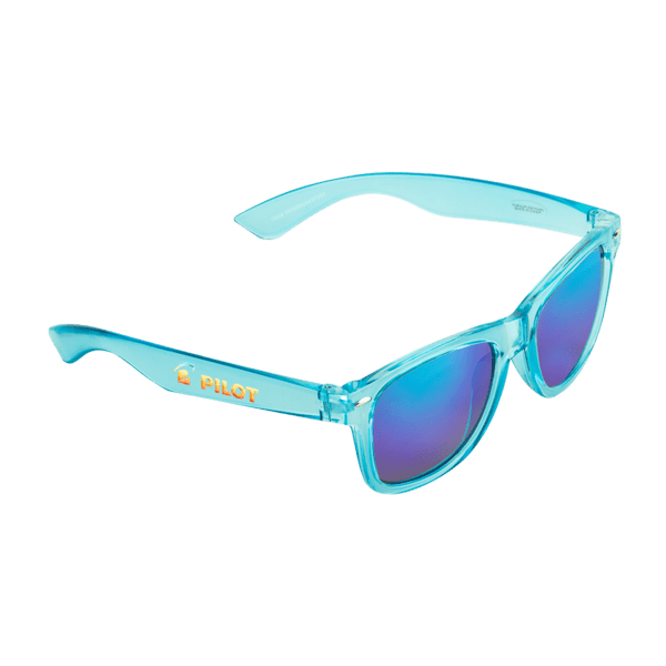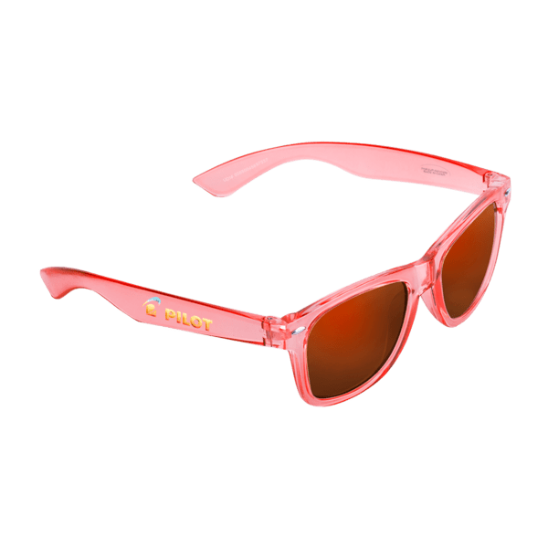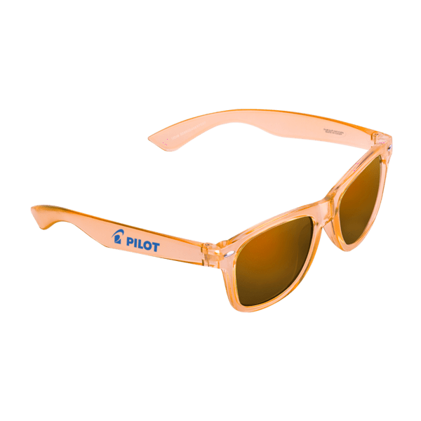Translucent wayfarer-style sunglasses with matching mirror-finish lenses. ABS frame and polycarbonate lenses provide 100% UVA/UVB protection.